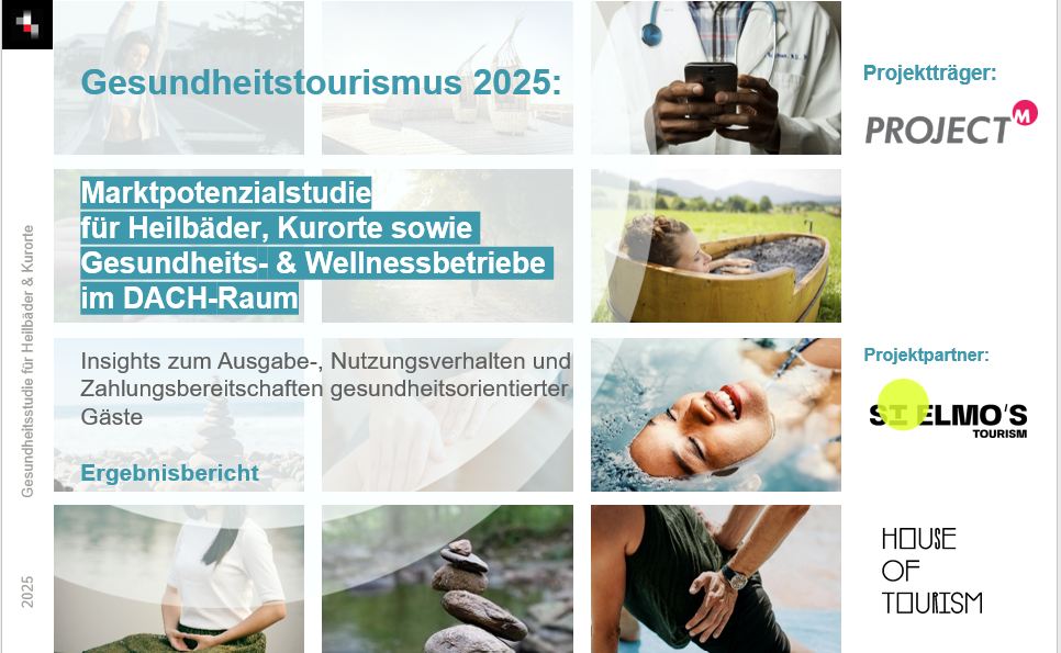 Mit der Studie „Gesundheitstourismus 2025: Marktpotenzialstudie für Heilbäder, Kurorte sowie Gesundheits- und Wellnessbetriebe im DACH-Raum“ liegt erstmals eine fundierte, DACH-weite Analyse zu den Bedürfnissen, Erwartungen, zum Ausgabe- und Nutzungsverhalten sowie zur Zahlungsbereitschaft gesundheitsorientierter Gäste vor.