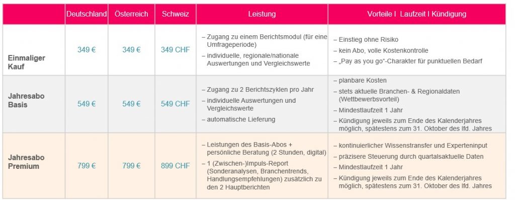 Alle Preise netto zzgl. Mwst. Hinweis: Eine Auswertung erfolgt nur, wenn eine ausreichende Stichprobe erreicht wird.